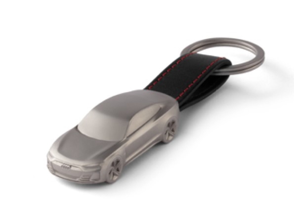 Nøglering i rustfrit stål formet som en Audi e-tron GT-skulptur. 3D e-tron GT-logo på undersiden. Rem af garvet læder med røde syninger
