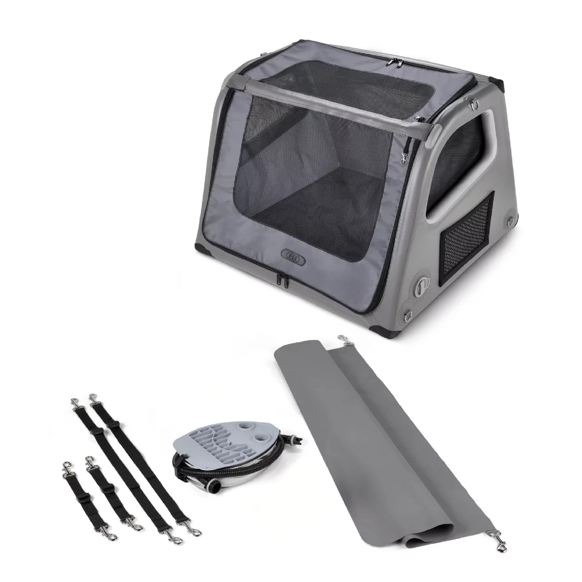Med den oppustelige Audi bagagerumsboks kan hunde i mellemstørrelse (se mål) transporteres nemt og komfortabelt. Boksen er imponerende nem og praktisk at håndtere, kan foldes i ikke oppustet tilstand og kan pustes op på meget kort tid. Boksen har tre fastgørelsesmuligheder per side, hvor den kan fastgøres til bilens dertil beregnede fastgørelsespunkter i bagagerummet (hvis de findes) ved hjælp af de medfølgende remme.