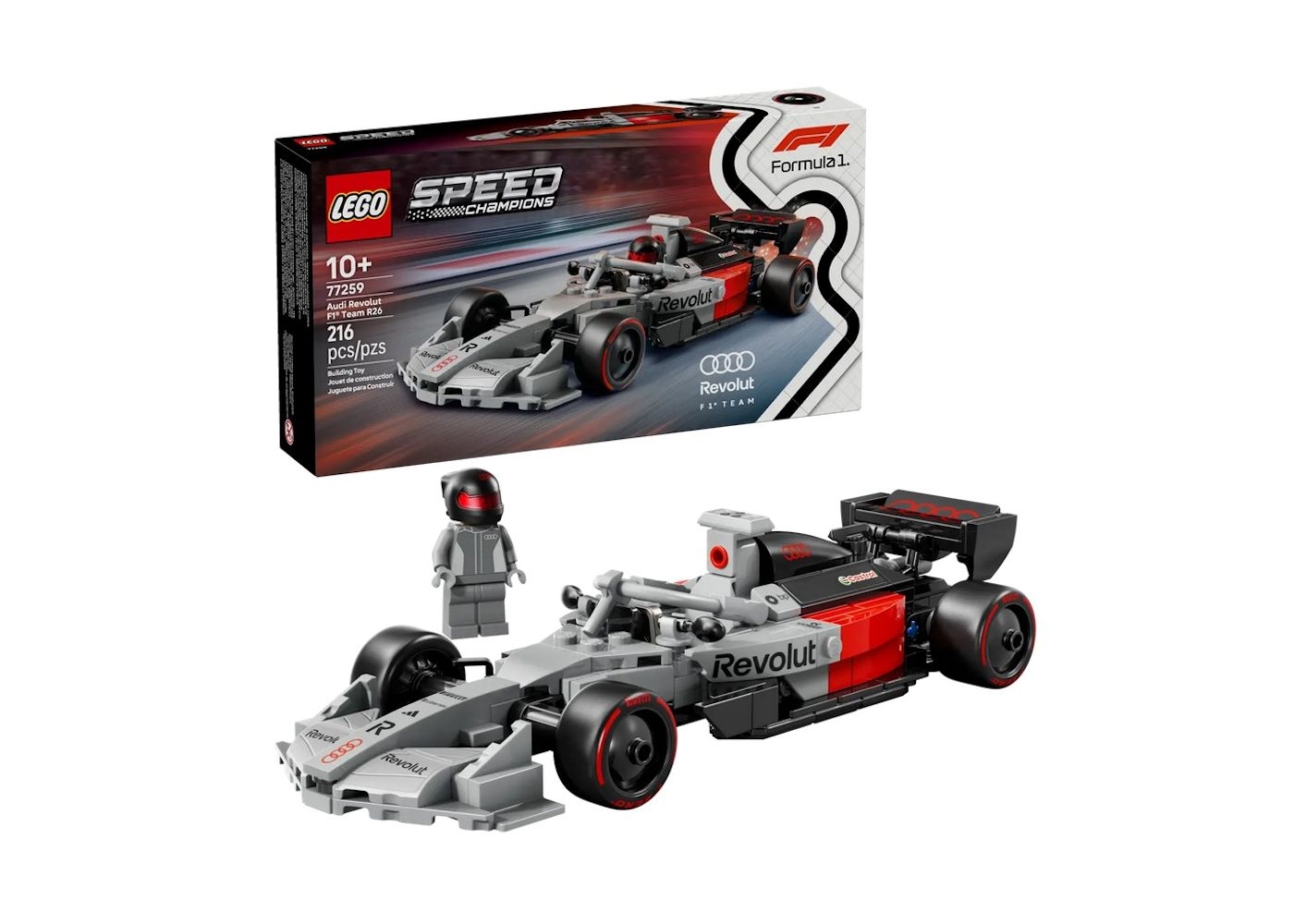 Til bilfans fra 10 år og opefter, der kan samle, bygge, udstille og ræse med denne LEGO® Speed Champions Audi Revolut F1® Team R26-racerbil. En autentisk udstillingsmodel som inkluderer detaljer som cockpit, hækvinge, sponsorlogoer, forhjulsophæng og dæk med "Pirelli" trykt på. En LEGO®-figur i Audi Revolut F1® Team-outfit og hjelm, der kan placeres i cockpittet, er inkluderet. Sættet indeholder 215 dele.